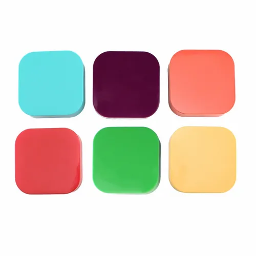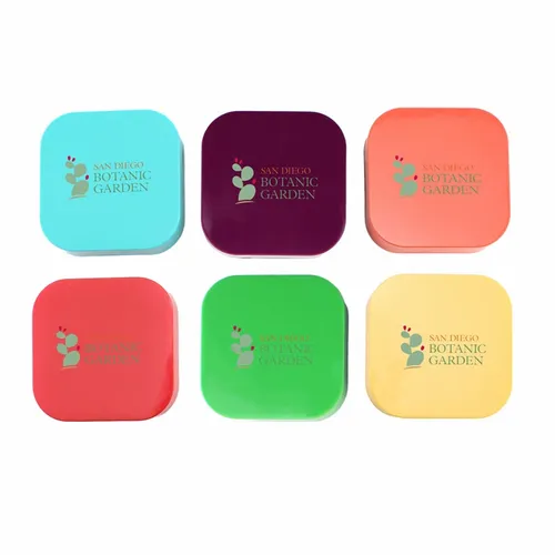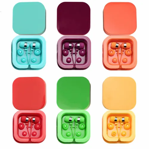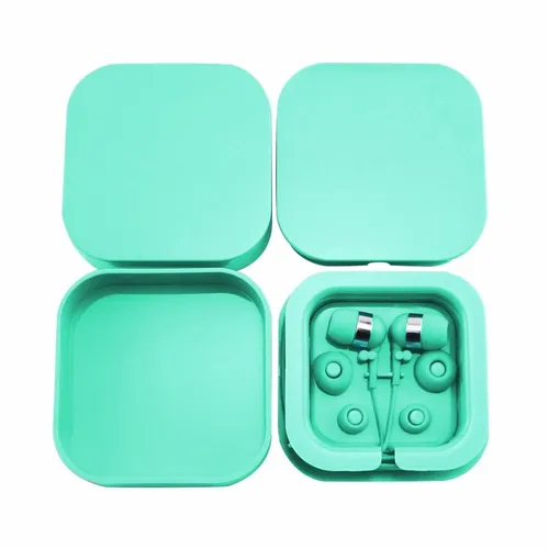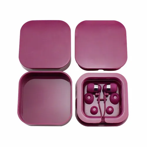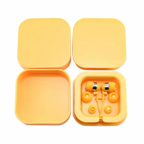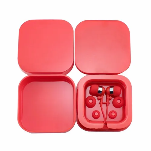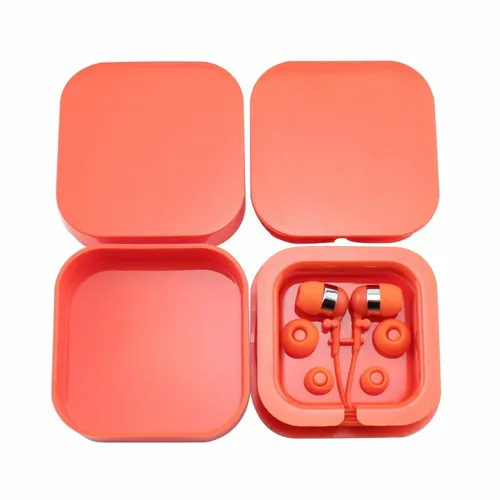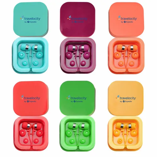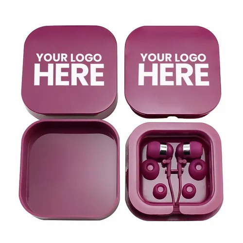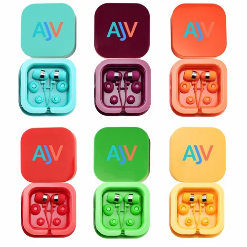 Plastic colourful ear buds in a square case with interchangeable ear bud covers. Print your logo on the case for a fun giveaway item!