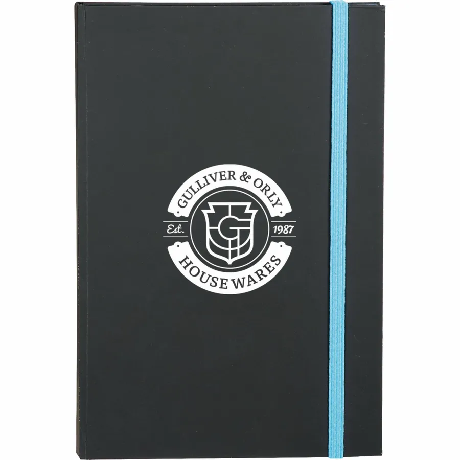 The 5.5 x 8.5 FSC Mix Color Pop Bound Journal features a hard cover with a soft matte black cover to highlight the most subtle or colorful logos. This custom Journal includes 96 sheets of FSC Mix cream lined paper with bright colored edges and corresponding color elastic closure.