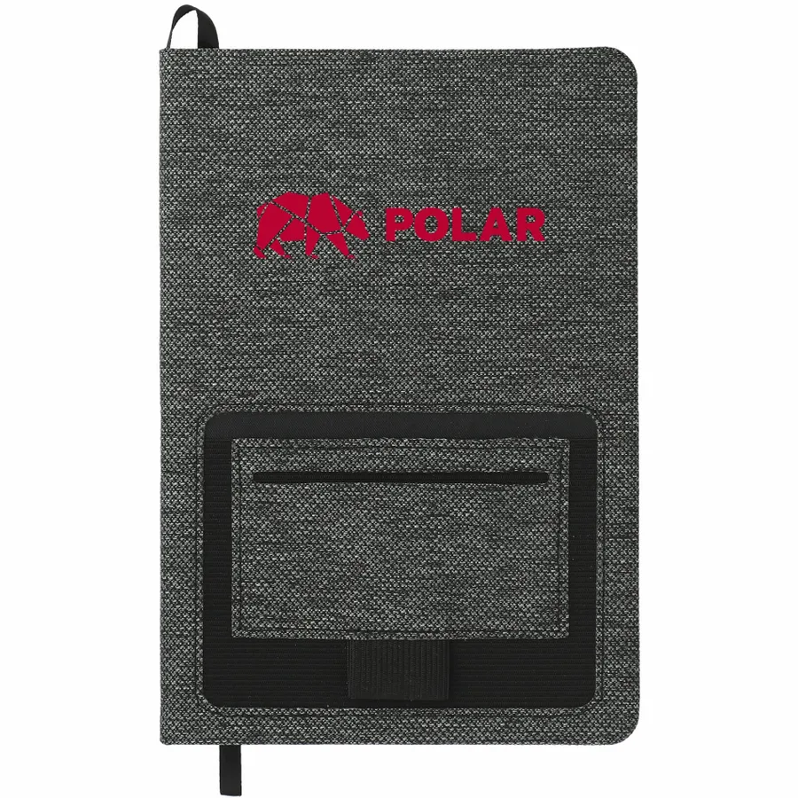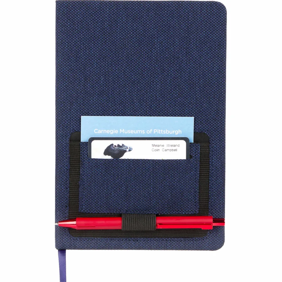 The 5.5” x 8.5” FSC Mix Vila RPET Bound Notebook features a hard, 100% Recycled PET cover with built in front pocket organization to hold a smartphone or business cards. Includes 80 sheets of cream lined FSC Mix paper, black ribbon page marker and black elastic pen loop. By choosing this notebook, youre making a positive impact on the environment, as one percent of sales are donated to environmental nonprofits through a partnership with 1% For The Planet.