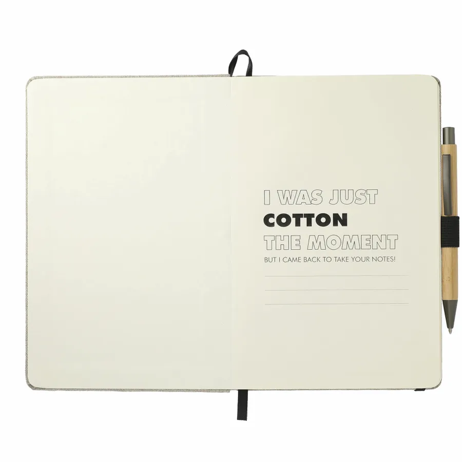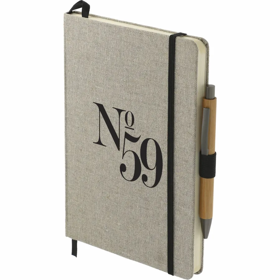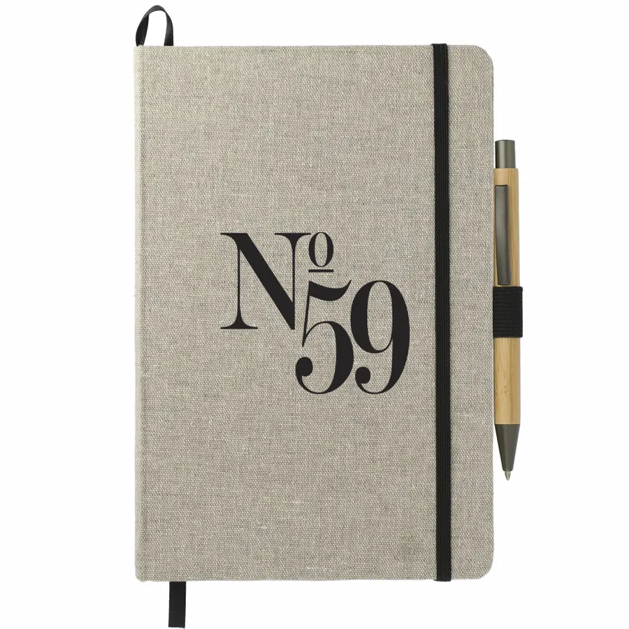 The 5.5 x 8.5 Recycled Cotton Bound Journal Set includes (2800-94) 5.5 x 8.5 Recycled Cotton Bound Journal and (1066-49) Bamboo Quick-Dry Gel Ballpoint. The 5.5 x 8.5 Recycled Cotton Bound Journal is the perfect journal for all of your notetaking needs. Features a recycled cotton, hard cover. Natural color elastic closure, pen loop and ribbon page marker. 80 sheets of FSC Mix cream lined paper. Back document pocket. FSC label printed inside. Through a partnership with 1% For The Planet, one percent of sales of this and all EcoSmart products are donated to environmental nonprofits.
