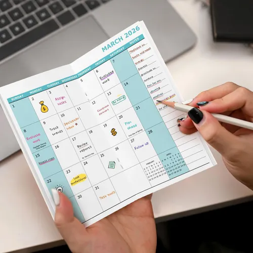 A portable planner designed to fit in your pocket or bag, perfect for weekly planning on the go.Size: 3.7 in x 6.8 inCover: Double adhesive paperPages: 128 pages (70g writing paper)Layout: Includes weekly planColours: White, Pink, Green, Navy BlueCustomisation: Gold foil, full-colour printingMaximum Printing Area: 2 in x 4 inIdeal for staying organised anytime, anywhere with a stylish, pocket-friendly planner.