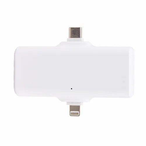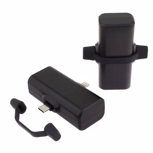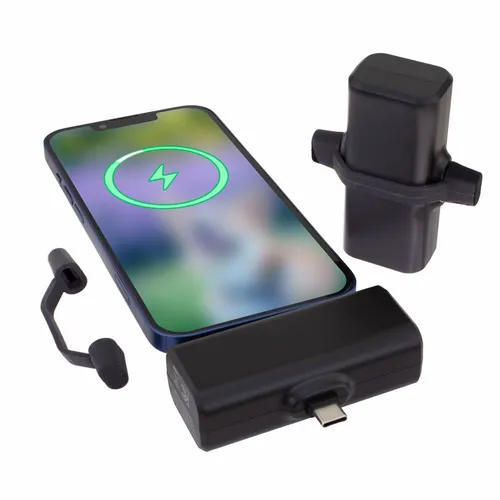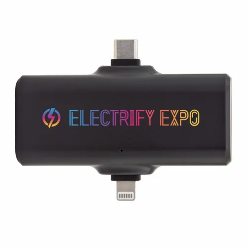 A portable 1800 mAh power bank with a Type-C input/output connector and Lightning output connector. Each connector is covered by a silicone band with caps that helps protect them when not in use.