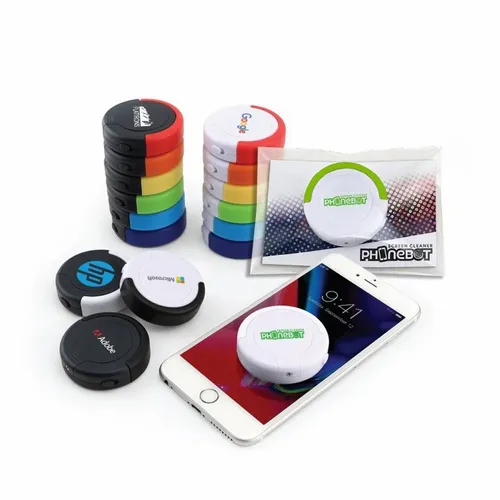 Tired of smudges and dust on your touch screens? Let PhoneBot do the dirty work! Simply switch PhoneBot on and place on your device screen. It will move across your screen wiping it clean. * To thoroughly clean screen, add pressure with finger and guide the unit across the screen. This fun gadget is equipped with replaceable CR2032 battery, a built in microfiber pad for cleaning, a variety of colour trims, a full colour imprintable body, and marketing card packaging!