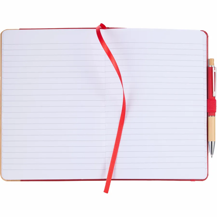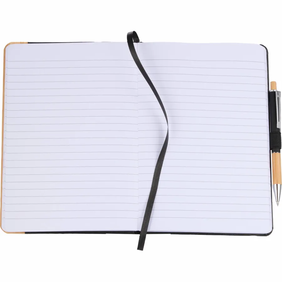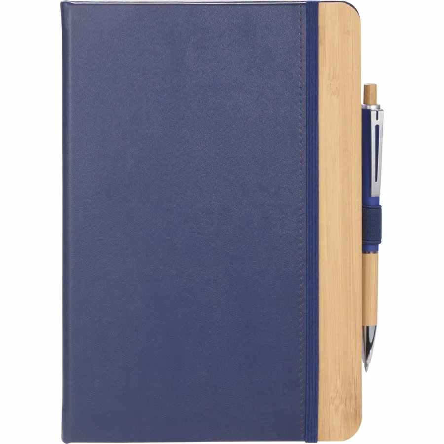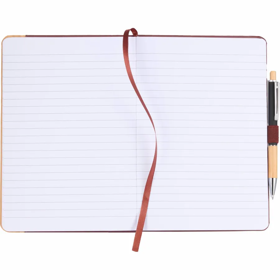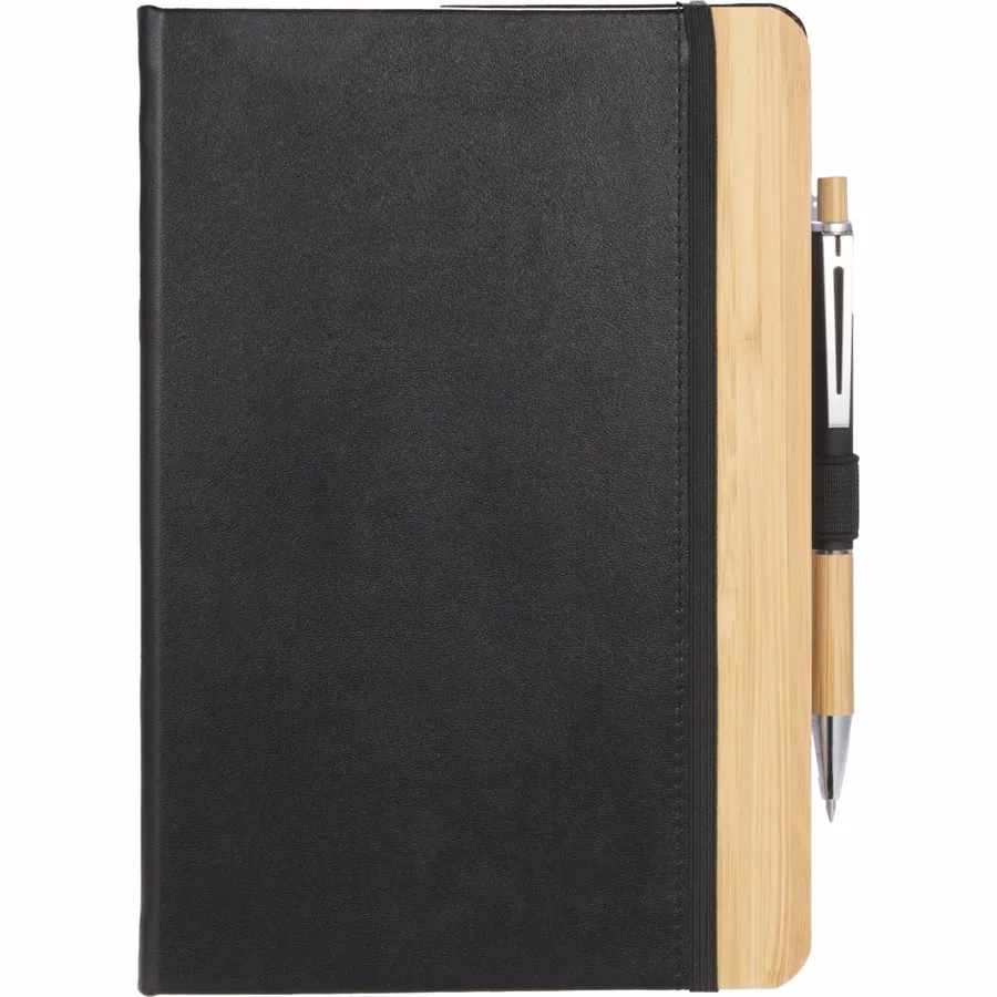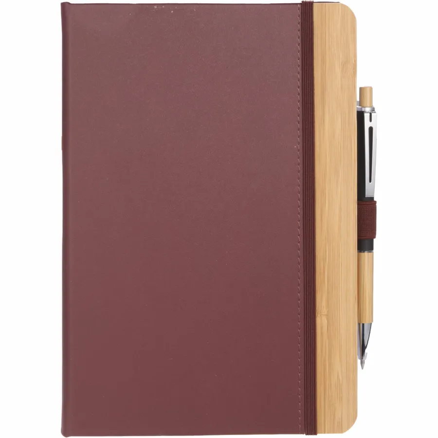 The 5.5 x 8.5 FSC Recycled Kia Bamboo Journal features a 30% bamboo fiber cover with a bamboo detail on the front. Includes 80 sheets of FSC recycled paper, back document pocket, ribbon page marker, elastic band closure and pen loop. Pen is not included. By choosing this notebook, youre making a positive impact on the environment, as one percent of sales are donated to environmental nonprofits through a partnership with 1% For The Planet.