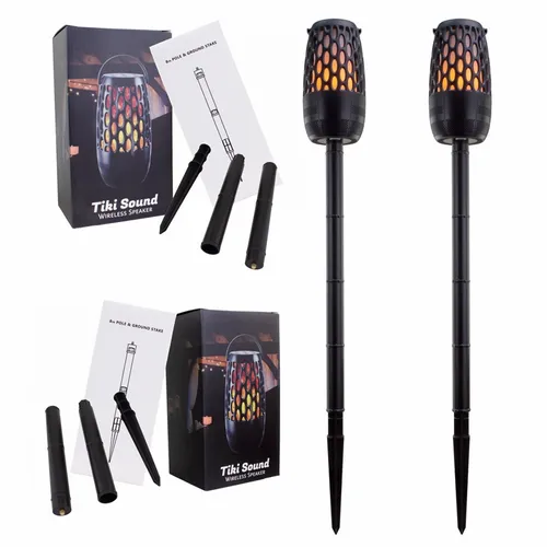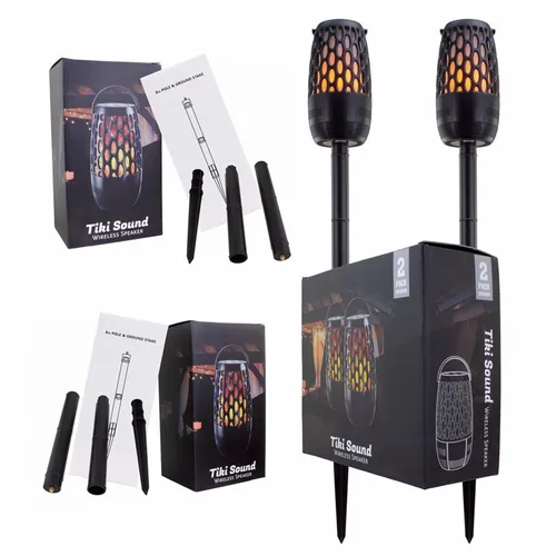 A fun pair of wireless speakers with different lighting modes and built-in sounds. Each has a handle, to easily suspend on a hook, and an attachable pole for placing them to the ground. When paired together, they support a True Wireless Stereo (TWS) function.